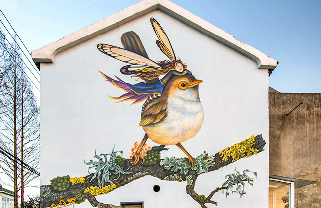 咖啡馆彩绘墙——自带饭勺的小鸟