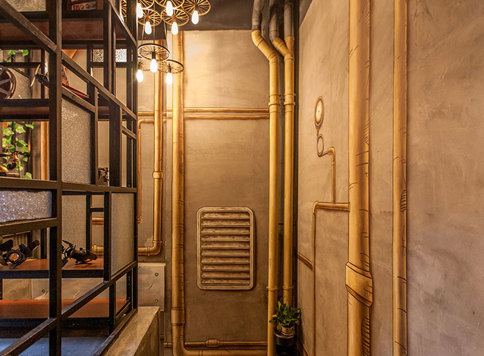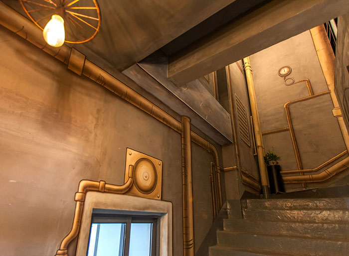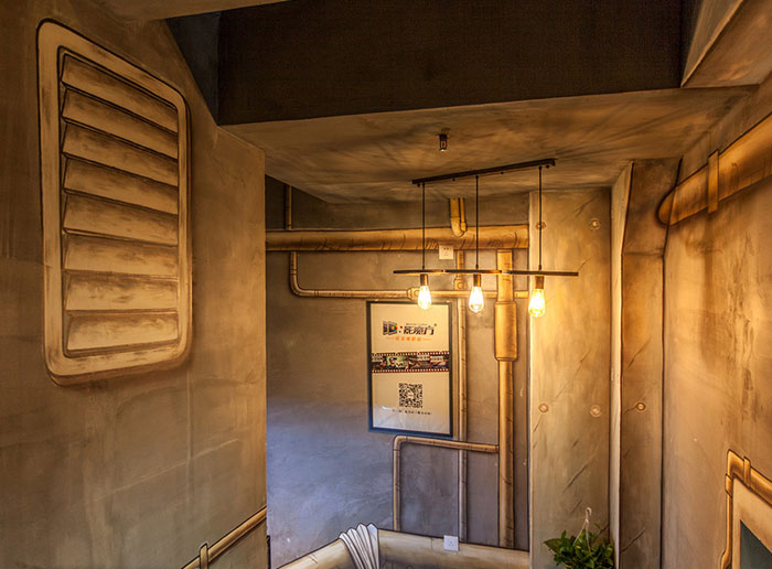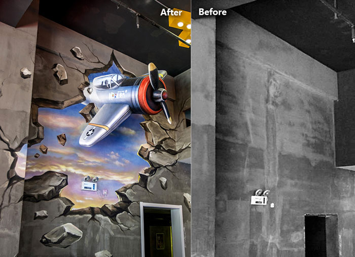 我们在大厅左侧做了一个飞机破墙而出的效果,飞机使用了实体,模型安装上去之后进行上色,并在周围画出混凝土开裂的效果。算是把整体的视线,从墙面自身的不足,引导到画面中来。