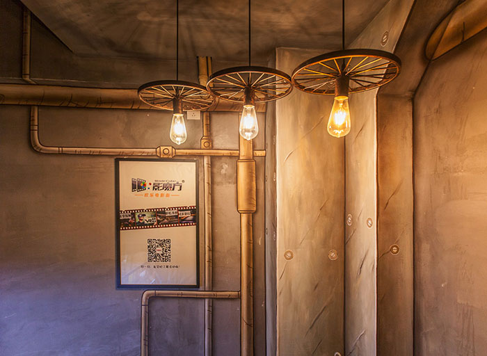 工业风是已经流行了很多年的一种装饰手法,不过客户的这个电影院里做的清水混凝土的确是让人不敢恭维,手法粗糙,极其不匀,算是所见过的清水混凝土墙最销魂的一个。